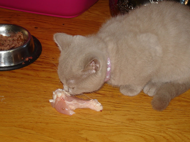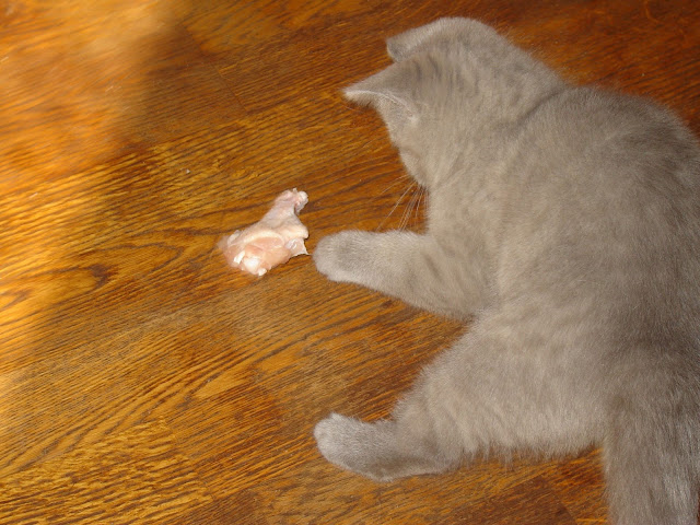 en nadat ze echt zeker weten dat de kippenpoot dood is, gaan ze allemaal een plekje zoeken om het op te eten. Goed voor hun gebit en goed voor hun spijsvertering. Rauwe botjes kunnen katten ook gewoon eten.
