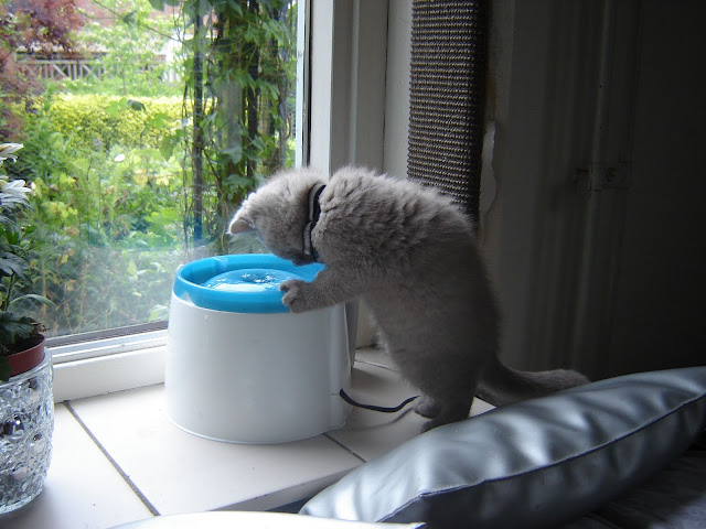 Ze steekt haar hele poot, neus en oren in het water., ze neemt eigenlijk een bad, terwijl ze drinkt. Ze spat alles rond, maar is helemaal vrolijk wanneer ze met dat ding bezig is.