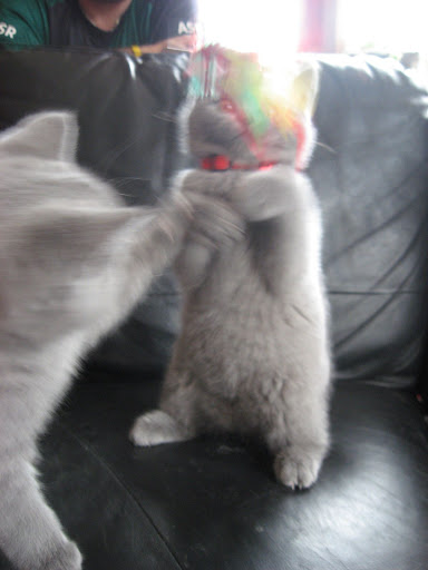 En natuurlijk vonden wij het heel gezellig, zelfs de cadeautjes zijn meteen favoriet bij de katten. Kees werd wel een beetje onrustig van alle visite, en dan ook nog eens Dinky die naar beneden kwam, die overigens meteen maar besloten heeft beneden te blijven en lekker op de bank ligt met Rik.